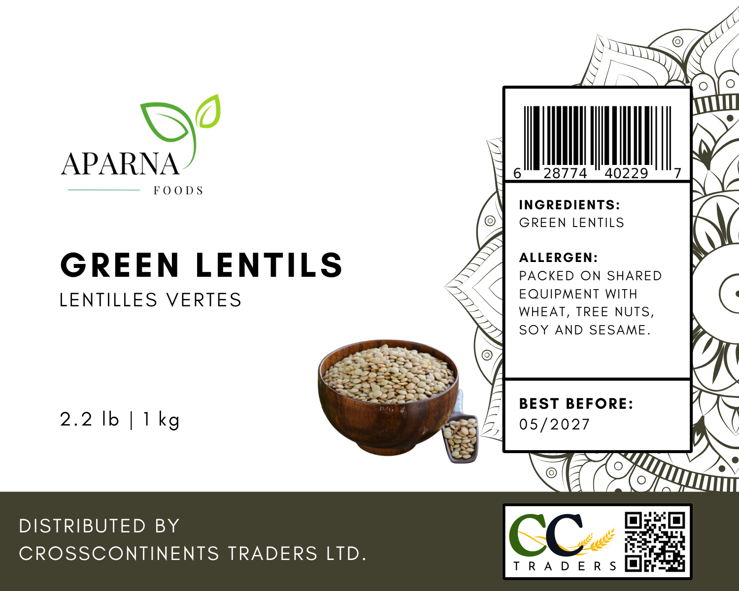 Discover premium quality green lentils from Aparna Foods, perfectly packaged in a convenient 1 kg bag. These versatile legumes are an excellent source of plant-based protein and dietary fibre, making them a nutritious addition to your pantry. The pale green lentils are carefully selected and processed to ensure consistent quality and cooking performance. They're ideal for creating hearty soups, flavourful dals, wholesome salads, and nutritious side dishes. These lentils cook evenly and maintain their shape well, offering a subtle, earthy flavour that complements a wide range of seasonings and cooking styles. The resealable packaging helps maintain freshness until the best before date of May 2027. Please note that this product is packed on shared equipment with wheat, tree nuts, soy, and sesame. Each bag contains 2.2 lb (1 kg) of premium green lentils, perfect for both everyday cooking and bulk storage.